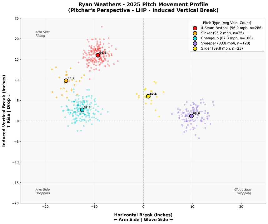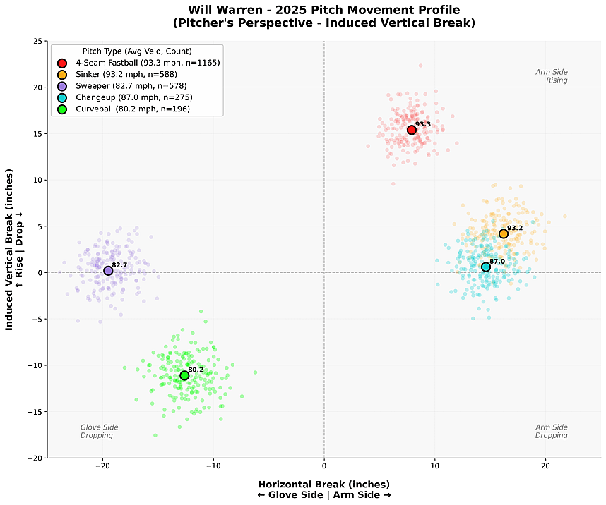 Warren’s changeup produced a 31.6% Whiff% with a high groundball rate in these right-on-left matchups last season, and if he can push the usage of that pitch more we could see more even platoon splits in 2026.