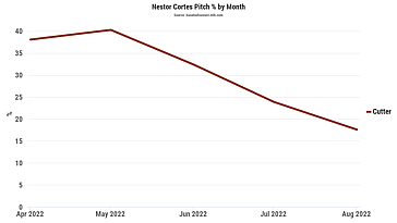 xwOBA is Expected Weighted On-Base Average, a metric that takes into account the quality of contact alongside strikeouts and walks. Scaled like OBP, lower for pitchers is better, seeing it balloon is not a great sign. Cortes’ Cutter had regressed. This just wasn’t a pitch Nestor could keep using as much as he had if he wanted to continue his successful season, he needed to find a new secondary pitch.