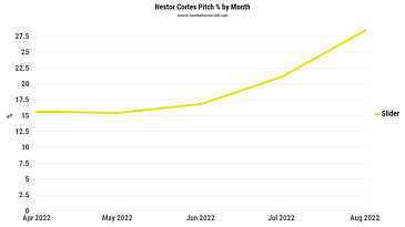 Nestor Cortes has always had more of a sweeping Slider, a pitch that generates a lot of horizontal movement and typically should be a high whiff pitch. Cortes didn’t get a ton of whiffs and strikeouts on his at first, but he began using it more instead of his Cutter, and it yielded great results.