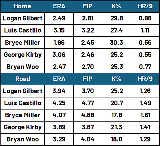 10% more runs were observed at Coors Field this past season whereas T-Mobile Park saw 11% fewer runs observed there, creating a nasty run environment where strikeouts are inflated and home runs are impossible to come by. Some would point out that the Mariners had a middling offense that could have affected these numbers, but the proof is in the performance of their top pitchers at T-Mobile Park versus on the road: