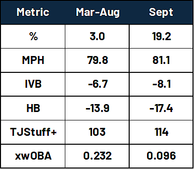 Max Fried improved the depth, sweep, and velocity of the pitch dramatically, utilizing it more in September and posting a 2.14 ERA with a 27.1% strikeout rate down the stretch as a result. It became an unhittable weapon that could work as a putaway pitch against lefties or a pitch to steal strikes with against righties, and it’s a pitch that the Yankees have always loved pushing the usage of.