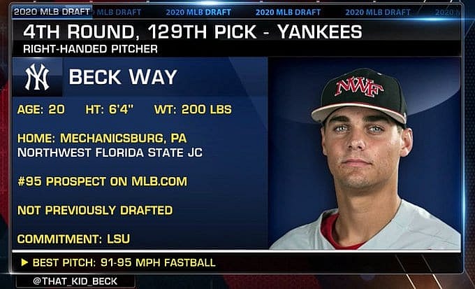 Beck Way is a pretty good pick by the Yankees as he is rated 85th best prospect by Baseball America while being rated 80th by FanGraphs, and 83rd by The Athletic. The New York Yankees have until August 1st to sign the 20-year-old. For a contract to be signed they first will have to convince him of foregoing his commitment to play at Louisiana State University. The signing bonus slot value for the 129th overall pick is $438,700.