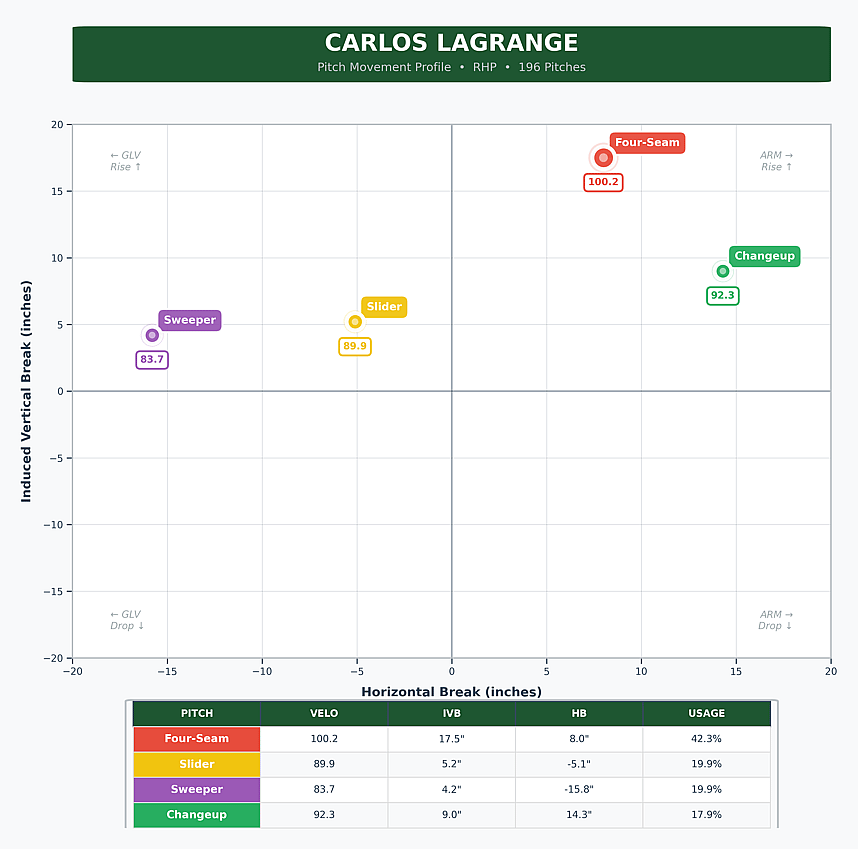 This is an elite-level pitch mix; we’ve mentioned numerous times in articles or podcasts that Lagrange has some of the best stuff in all of baseball and it’s not really an exaggeration.