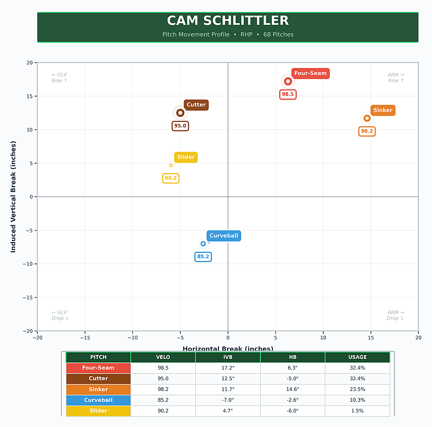 Throwing a nastier version of his fastballs while continuing to have that top-line velocity we saw last summer, Schlittler was able to tear apart an offense that combined for a .767 OPS and 116 wRC+ last season against RHP.
