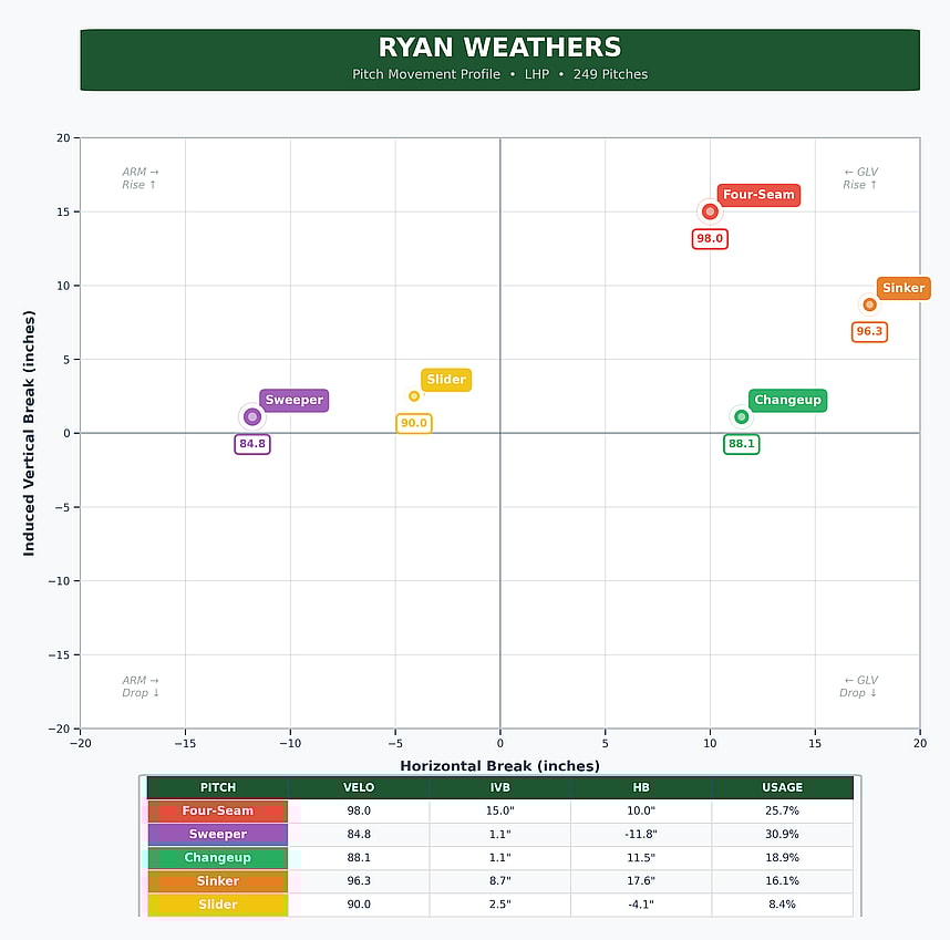 My final case against the idea that this ERA is even remotely telling of what’s next for Weathers is that he’s maintained excellent whiff rates (32.5%) with a 21.8% K-BB%.