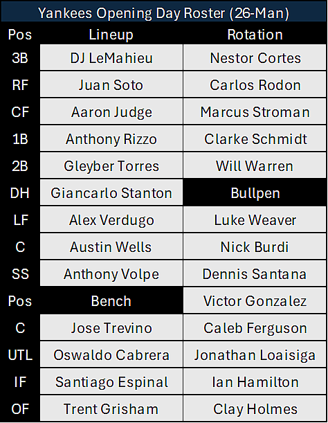 Will Warren is a rookie with zero MLB experience, there will naturally be learning curves and things for him to learn, and he may get battered around. Clarke Schmidt is another name still cutting his teeth as an MLB starter, and the hope is that his progression can make up for some of the value they lost with Gerrit Cole’s injury. There’s no questioning the uncertainty of their rotation, but this 26-man roster should be able to hold it down for the first half of the season if they can remain relatively healthy and play to back of their baseball cards.