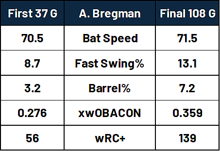 Bregman turned the power on, smashing 25 home runs in just 108 games with a 139 wRC+, a change that came about as a result of a swing change on May 13th. In fact, he pulled over on the side of the road to record himself discussing the changes made to how he directs the knob of his bat, and while those finer mechanical tweaks are harder to capture in film, we do have bat tracking data that shows improvements in swing speed that may have helped him crush the ball consistently.
