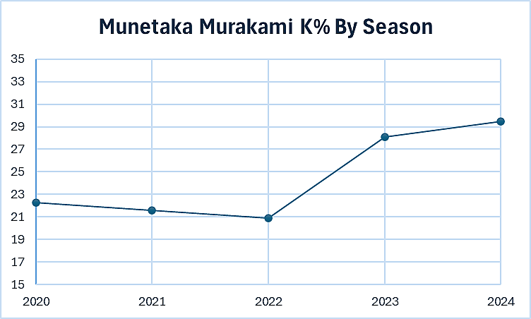 It’s important to note that a big reason for the dropoff in OPS over the past two seasons stems from a run environment that has collapsed league-wide something that could be a product of changed baseballs among other things. I’m not as much concerned about the production as I am about the swing-and-miss rates, as there’s no question about whether Murakami has the power or plate discipline to excel at Yankee Stadium, but rather the ability to make contact.
