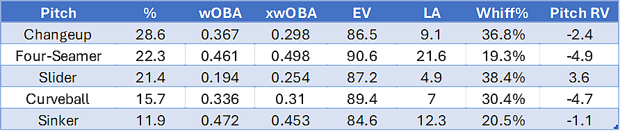His slider performs best against right-handed batters, but it’s behind his worst-performing pitch against righties (four-seamer), and while his sinker isn’t great, it likely would do a better job than his four-seamer as his primary fastball. It makes sense, seeing how sinkers play better to same-handed hitters and four-seamers play better to opposite-handed hitters, and there could be added utility in using his sinker more based on his changeups’ pitch shape. The two pitches could play off of each other well due to similar arm-side movement, with the velocity differential throwing batters off.