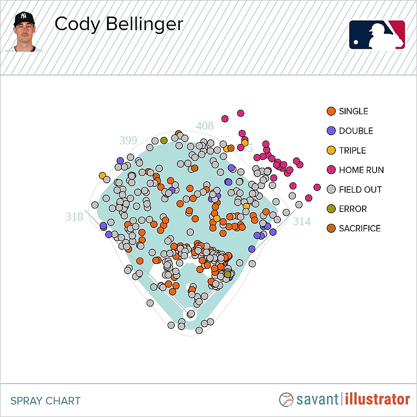 Looking at his spray chart overlaid on Yankee Stadium, Cody Bellinger’s swings are perfect for the dimensions of the ballpark, which help lefties who can consistently pull the baseball.