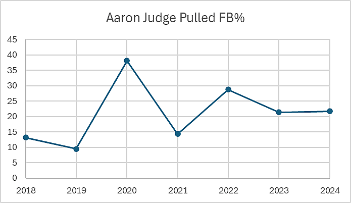 There’s a huge increase in the pulled flyball rate from 2018 to 2024 (ignore 2020, which was a 28-game sample), and that one small tweak has allowed Aaron Judge to perform around his expected numbers. He ranked in the 13th Percentile in Pulled Flyball Rate in 2021 and the 61st Percentile in Pulled Flyball Rate this season, but trying to pull the ball in the air comes with a trade-off, as it requires a hitter to make an earlier swing decision to get out in front. Usually, that results in more chases and strikeouts, but somehow it’s been the opposite for Judge.