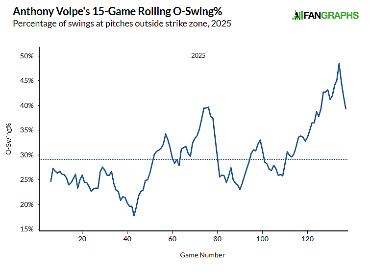 Worsening plate discipline has plagued Volpe, who is expanding the zone more and has just seven walks in his last 206 plate appearances.