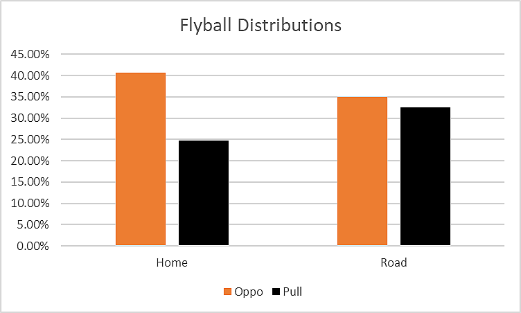 Pulled flyballs result in farther-traveling baseballs, and you can overperform metrics like xwOBA when you have elite directional sprays on flyballs. When we look at his flyball distribution at home and on the road, we see a clear attempt to change his approach and play at his ballpark more.