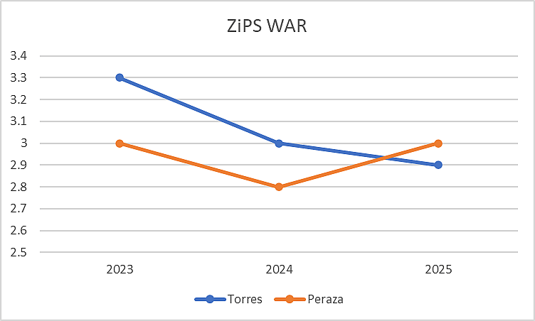 It’s also important to note that you’re going from a 115 wRC+ hitter in Torres to a 95-100 wRC+ bat in Peraza but going from a team 57 wRC+ to a 110 in LF. As mentioned earlier, it’s also possible that Peraza matches or surpasses Torres in terms of WAR value because of his defense and baserunning, alongside room for him to become a better hitter than most scouts pegged him as.