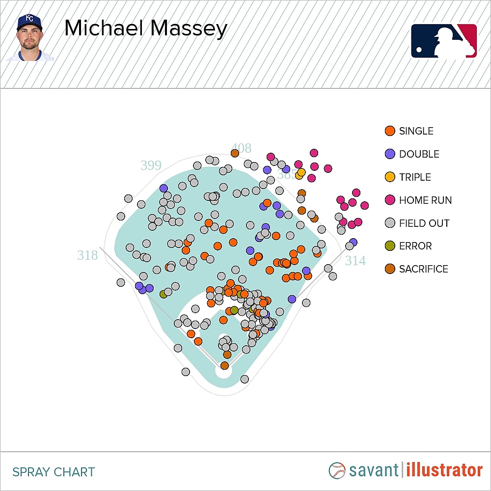 Michael Massey enjoyed a good but not great season with the Royals last season as their primary second baseman, posting a 102 wRC+ with 14 home runs across 100 games. While his OBP (.294) isn’t very enticing, the 26-year-old infielder has some good power to right field and could fit right into the bottom half of the Yankees’ offense thanks to his pulled flyballs, as his swing is quite literally built for the Bronx.