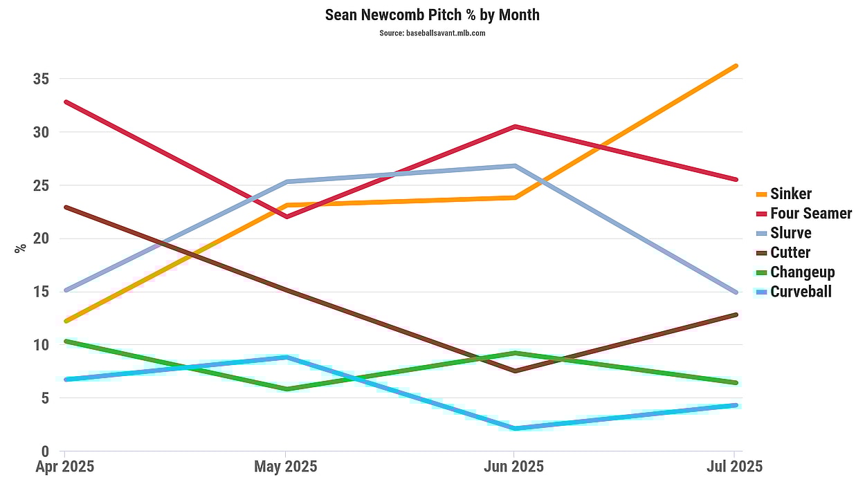 Sean Newcomb’s cutter was highly ineffective at missing bats or limiting damage contact, so he’s reduced the usage of that pitch dramatically, and we’ve also seen him rely on his sinker more.