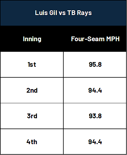 While I remain intruiged about his sinker being a potential weapon against right-handed batters, Gil’s poor command and strike-throwing abilities illicited the same reaction out of him that we saw in 2025; pulling back his fastball velocity.