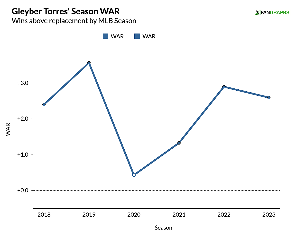 In terms of whether Torres will net the value on a deal ranging between $90 million and $100 million, his 2.5-3 WAR median for outcomes roughly comes out to $20 million to $24 million a year for him to return $8 million per WAR, the going rate for WAR in the modern age. Data even suggests teams pay closer to $9 million per WAR if a player is a 2+ WAR player, as in 2022, the going rate for players that accumulated over 2 fWAR that season was $8.5 million, and by that scale, we go to $21.25 million to $25.5 million for his average annual value.