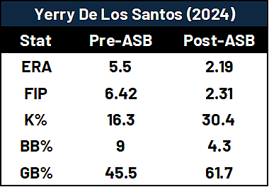 With a 4.12 ERA and 21.3% K% in Triple-A, it makes zero sense to be excited about Yerry De Los Santos, but the Yankees worked with him to make some important tweaks to his usage rates midseason. Through the first half of the 2024 season, De Los Santos had a 5.50 ERA and 6.42 FIP, putting him in the kind of territory where he could find himself cut by the Yankees to make room for other arms coming through their Minor League system. His inability to miss bats stemmed from how often he threw his sinker, a pitch designed to get weak contact, not generate whiffs.