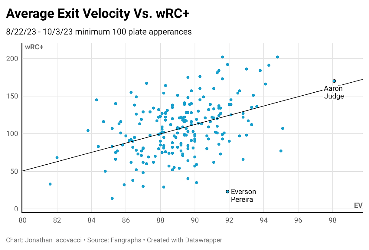 In that same sample, looking at the distribution of Average Exit Velocity against wRC+, Pereira severely underperformed his batted ball numbers in his limited stint in the big leagues. The only person on this list with a lower wRC+ than Pereira is Whit Merrifield, who had an average exit velocity almost six miles per hour less than Pereira.