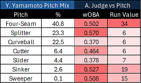 Yoshinobu Yamamoto throws two pitches that Aaron Judge absolutely demolishes in the four-seamer and splitter, and while I expect a heavy dosage of sliders away to try and get whiffs, Judge can do damage here. In his first matchup with the Japanese-born ace, he went 1-2 with a double and walk, and while that’s not nearly enough of a sample size to determine whether he sees Yamamoto well or not, there are reasons to like this matchup for the Yankees.
