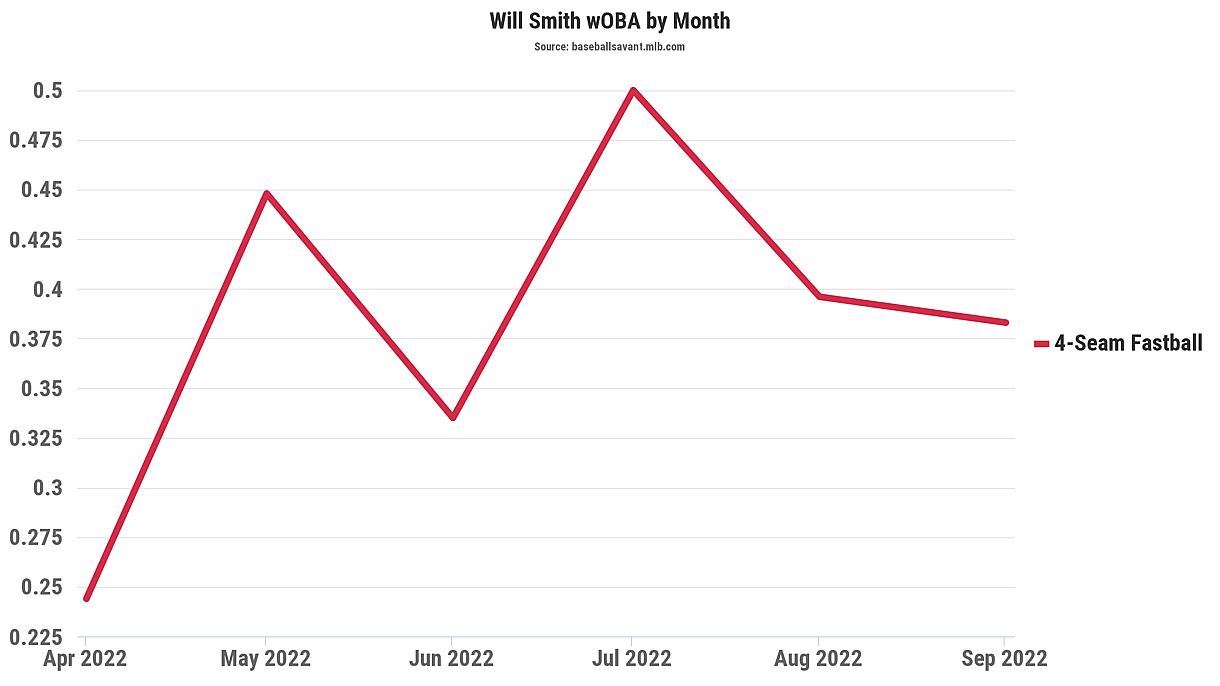 Will Smith was the closer for the Atlanta Braves and integral to their World Series in 2021, tossing 11 scoreless innings and going 6/6 on save opportunities. That being said, 2022 was an absolute trainwreck, with Atlanta posting a 4.38 ERA and 5.22 FIP. Smith’s four-seam fastball simply wasn’t effective anymore, posting a 7 Run-Value and giving up a .505 SLG% against the pitch. While it still has above-average vertical movement, it simply doesn’t have the velocity or vertical approach angle to be a highly-effective pitch. With a horrific 72.5 Stuff+ and 88.3 Pitching+, Smith would have to shift to a different primary pitch.