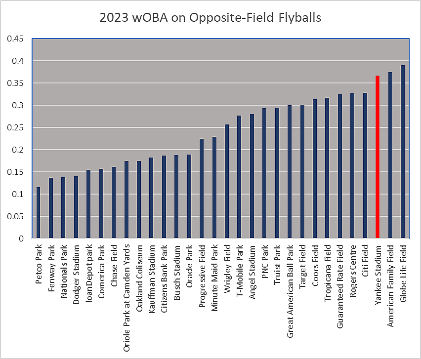 Add on the fact that he still isn’t arbitration eligible and would have three years of control remaining at the conclusion of the 2023 season, and he’s suddenly a piece not just for the present but for the future as well. For those still wondering if the approach McCormick has would generate that significant of an advantage, let’s look at how Yankee Stadium ranks amongst all ballparks in opposite-field wOBA on flyballs hit by right-handed hitters.