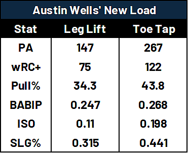 Yankee Stadium does suppress BABIP for left-handed hitters, so I’m not surprised that Austin Wells struggled to hit for average, but his league-average .167 ISO will almost certainly improve in 2025. Steamer projects a decrease in walk rate for the young catcher from 11.4% to 9.9%, a regression I disagree with, but the improvements to his SLG% and ISO are ones I do agree with. One of the big changes that Wells underwent was adjusting his load at the plate, planting his leg sooner which allowed him to get into launch position a lot sooner instead of being behind at the point of contact.