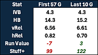 Subtle changes in his release points have resulted in a bit more run, and when you mix all of these small changes together, you have a pitch that has upticked by multiple standard deviations in Stuff+. In 2023 his sinker had a 119 Stuff+, serving as his go-to weapon to get groundballs and avoid damage contact. Over this stretch, Holmes has a 2.25 ERA and 3.36 SIERA, encouraging signs that he’s getting somewhat on-track after a rough summer.