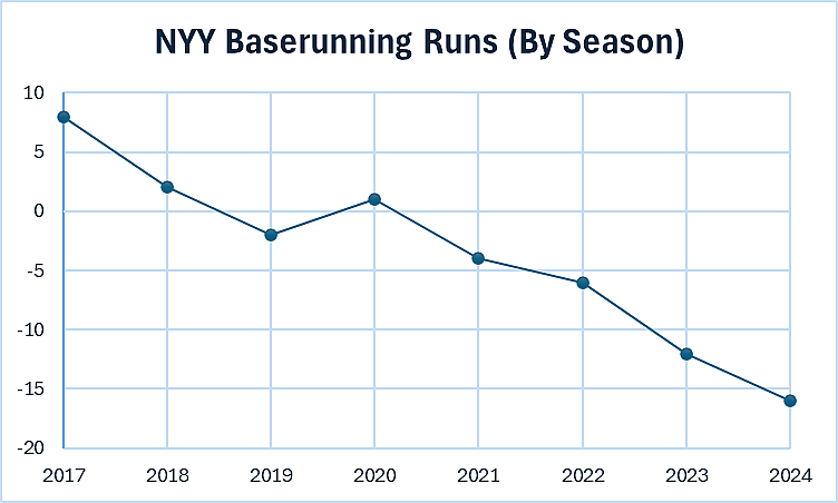 Baserunning Runs can track baserunning value all the way back from 2016, and in that timespan, the 2024 Yankees posted the second-worst mark as a team (-16). Only the 2018 Blue Jays grade out as a worse baserunning team, and they’re also an exception in the sense that they were the only team with -10 Runs or worse to make the playoffs and win a playoff game.