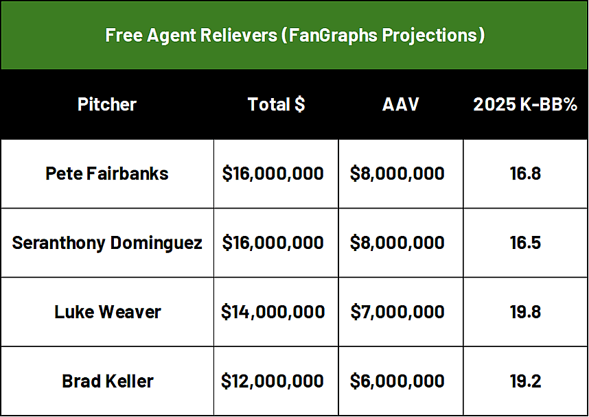 Weaver had the best K-BB% in 2025 of all of these relievers who FanGraphs have grouped together for contracts in this market, and it’s why he could be a steal.