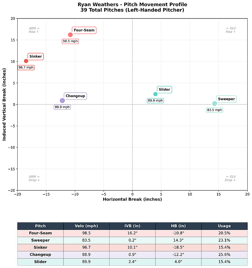 The incredibly-high pitch grades on Ryan Weathers’ mix last night resembled the likes of a frontline Game 1 starter, but his depth of repertoire and feel for mixing it up was just as impressive.