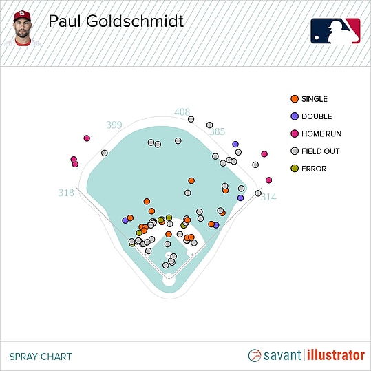 If Goldschmidt can incorporate more opposite-field flyballs in his game, he may not have to swing earlier and deal with the drawbacks in his walk rate and contact rate, but Busch Stadium has never been the ballpark for that kind of approach. Last season the veteran first baseman slugged an abysmal .378 at home with an 85 wRC+, but he would have had far more success if he played his home games in the friendlier dimensions of Yankee Stadium:
