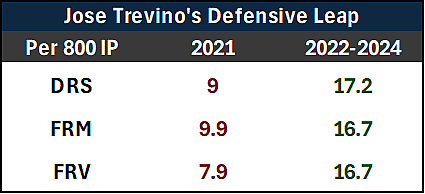 In 158 innings last year, Wells had -2 Defensive Runs Saved and -2 Fielding Run Value, struggling to provide any value outside of his solid framing skills, but he’s done a complete 180 in 2024. He’s one of just four catchers with double-digit DRS (+10) while also having 6 FRV and a whopping 8.1 Framing Runs, and while I don’t expect him to win the AL Gold Glove, he has a good shot to finish as a finalist for the award. His defensive improvements have steadied the ship in Trevino’s absence, and he’s come into his own as a two-way catcher.
