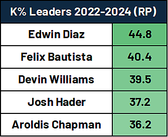 Devin Williams is one of the best closers in the entire sport, sporting a sub-2.00 ERA in four of his last five seasons thanks to his nasty changeup. Dubbed the “Airbender”, it generates tons of movement that’s made even more deceptive by his unique mechanics and release points. No one generates more horizontal run on their changeup than Williams does, who averaged 19.4 inches of arm-side movement on it since 2022 with over 40 inches of drop.