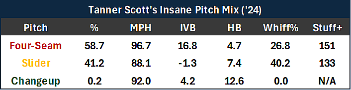 Suddenly, your bullpen becomes even deadlier, because teams are getting different looks in the seventh, eighth, and ninth innings with no way to adjust in just one at-bat. Lineup diversity is overstated, but bullpen diversity can often get overlooked. The Yankees don’t have many guys with good riding fastballs that generate whiffs, especially from the left-handed side, and Tanner Scott could give them more variety alongside the already incredible value he brings to the table.