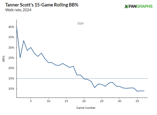 The first metric that might stand out to you is his 14.9% walk rate, which is nearly double what we saw in 2023 when he had his best season to date. You might look at that and use it as a reason not to trade for Tanner Scott, and while I do believe that’s a fair criticism, his walk rate has gotten lower and lower as the season has gone on. Through his first eight games, the Marlins’ closer had 12 walks compared to 23 walks on the season, meaning over 50% of his free passes came in the first few games of the season.