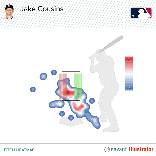 The graphic above shows you the heatmap of where Jake Cousins is throwing his slider to left-handed batters, and there are two spots where he’s aggressively attacking. The first is the backdoor slider, and this pitch is great because it gets so many called strikes. The red block represents the side of the zone where lefties are more likely to take a right-handed slider with a sharp angle toward them, so it makes sense that Cousins is going there in-zone the most.