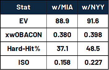 Hitting the ball harder and pulling it more will almost always improve a hitter’s batted ball data and their power output, but not everyone makes that adjustment because of the usual drawbacks. The balance between quality and quantity of contact is one that can be difficult to manage, but Chisholm’s Zone Contact Rate barely decreased with the Yankees while seeing a 1.3% decrease in strikeout rate.