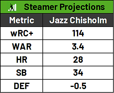 Having a median outcome with a near 30/30 season is quite impressive, but the projected WAR total of 3.4 is where I have my focus. Steamer projects Jazz Chisholm to be a negative defender because they currently believe he’s a centerfielder, and while that’s certainly a possibility if the Yankees are unable to retain Juan Soto, it’s also possible that if Soto returns he remains a third baseman.