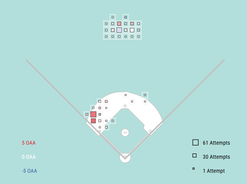 Now there are two schools of thought on his defensive abilities at third base; his errors and inexperience make his -2 Defensive Runs Saved the most accurate representation of his defensive abilities there. Then there’s the idea that his elite range and arm make him more of the defender that Outs Above Average (+6) and Fielding Run Value (+5) grade him out as/