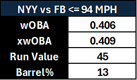 The Royals’ active roster still averages around 94 MPH on their fastballs, putting them 20th among 30 MLB teams, and there is no team in baseball better against fastballs at or below 94 MPH than the Yankees.