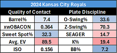 This is an aggressive offense that can ambush a pitcher with immediate contact, but they lack some of the core skills of a modern offense. Kansas City has a very old-school offense, they have their big power bats and surround them with scrappy hitters who don’t have much power and play great defense. What’s most surprising about the Royals is that they are sixth in average bat speed as a team, meaning they swing hard and still have excellent contact rates, an incredible quality that comes with a massive flaw.