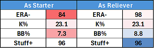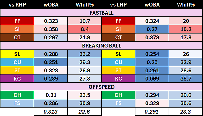An aggressive offense that swings early in counts leaves itself very susceptible to breaking pitches and offspeed pitches, as it only holds an above-average wOBA against right-handed sweepers and left-handed splitters. All of these serve as ways to pick up swings and misses against an offense that otherwise doesn’t strike out much, so while the approach shouldn’t be just to abandon the fastball, it should be to mix in secondaries heavily.