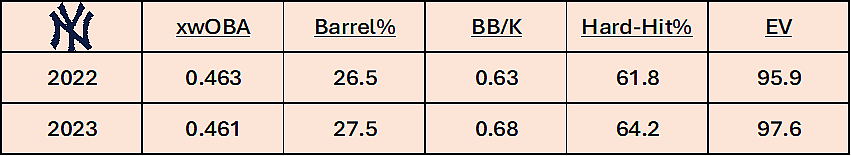 He’s maintained all the skill progressions from his historic 2022 season, where he set the American League home run record (62) and posted a wRC+ north of 200, the first hitter to do so in a full season since Barry Bonds. When looking at Judge’s underlying metrics, everything suggests he’s still capable of having a 60-home run season again: