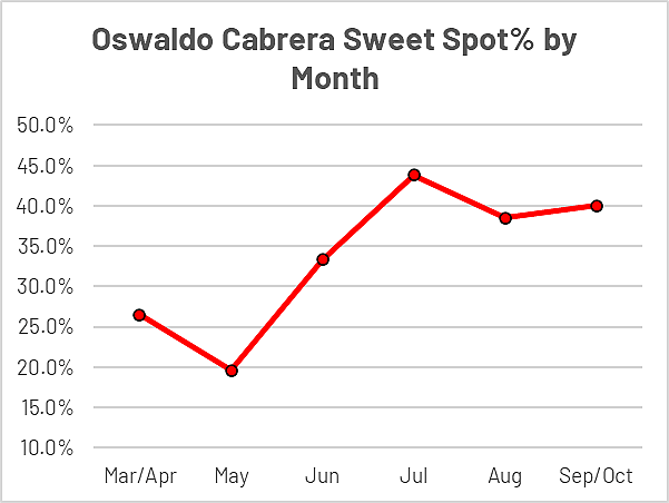 What made Oswaldo Cabrera good wasn’t an excellent raw power tool, great contact rates, or his swing decisions, but rather his propensity to pull the ball in the air. Cabrera slashed .269/.348/.503 last season with 9 HRs in 52 games at the Triple-A level, good for a 124 wRC+, and while it came with a high strikeout rate (25.2%), it also came with plenty of game power. His .234 ISO was well above average, and he did so with a flyball rate of 47.1%, with that number climbing to 50% in his brief Major League stint last year.