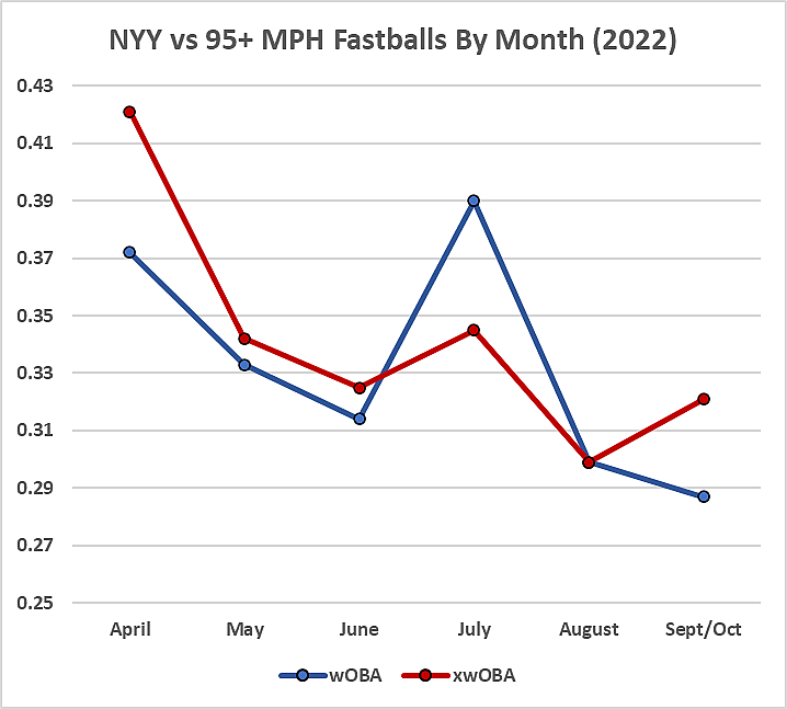 The Yankees declined significantly in their performance against high velocity as the season carried on, and after being first in wOBA against breaking pitches last season, the Yankees are one of the five worst teams in baseball against that same pitch this season. It makes sense when you realize in 2022, the Yankees had the oldest position player group in baseball with an average age of 30.2, and in 2023, they rolled back an identical lineup, but everybody was a year older with no changes to their offseason routine, but they can look at the West Coast for an example of what they should have done.