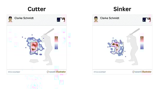 With a 28% Whiff Rate and .319 wOBA against lefties this season, the cutter has been his primary offering in those situations at a 42.4% Usage Rate. The confidence he has in this pitch is improved, but he’s also sequencing much better thanks to the way he’s used his sinker in these situations. Clarke Schmidt developed the cutter so he could stay away from the sinker in these matchups, but it has emerged as an excellent offering in these matchups because of how these two fastballs play off of each other.