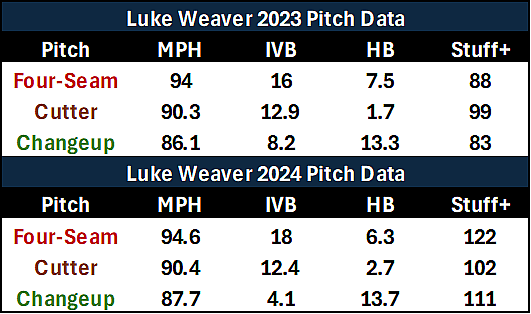 When he came over to the Yankees, the team had him focus on the three key pitches he’s always had in his four-seamer, cutter, and changeup. These three pitches didn’t grade out particularly well according to Stuff+ last season, but seemingly small tweaks made over the winter have completely changed the way that Weaver can attack hitters right now.