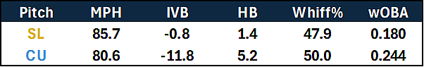 The star of the show here is his slider, a pitch he’s starting to use more and more to great success. On its own, his slider is a fantastic pitch thanks to how close it hovers to the zero-line in terms of movement. A pitch that sits at the zero-line vertically and horizontally can give hitters nightmares as they helplessly swing over a ball that drops ferociously, and it’s played up even more thanks to a four-seamer that can sit at the top of the zone.